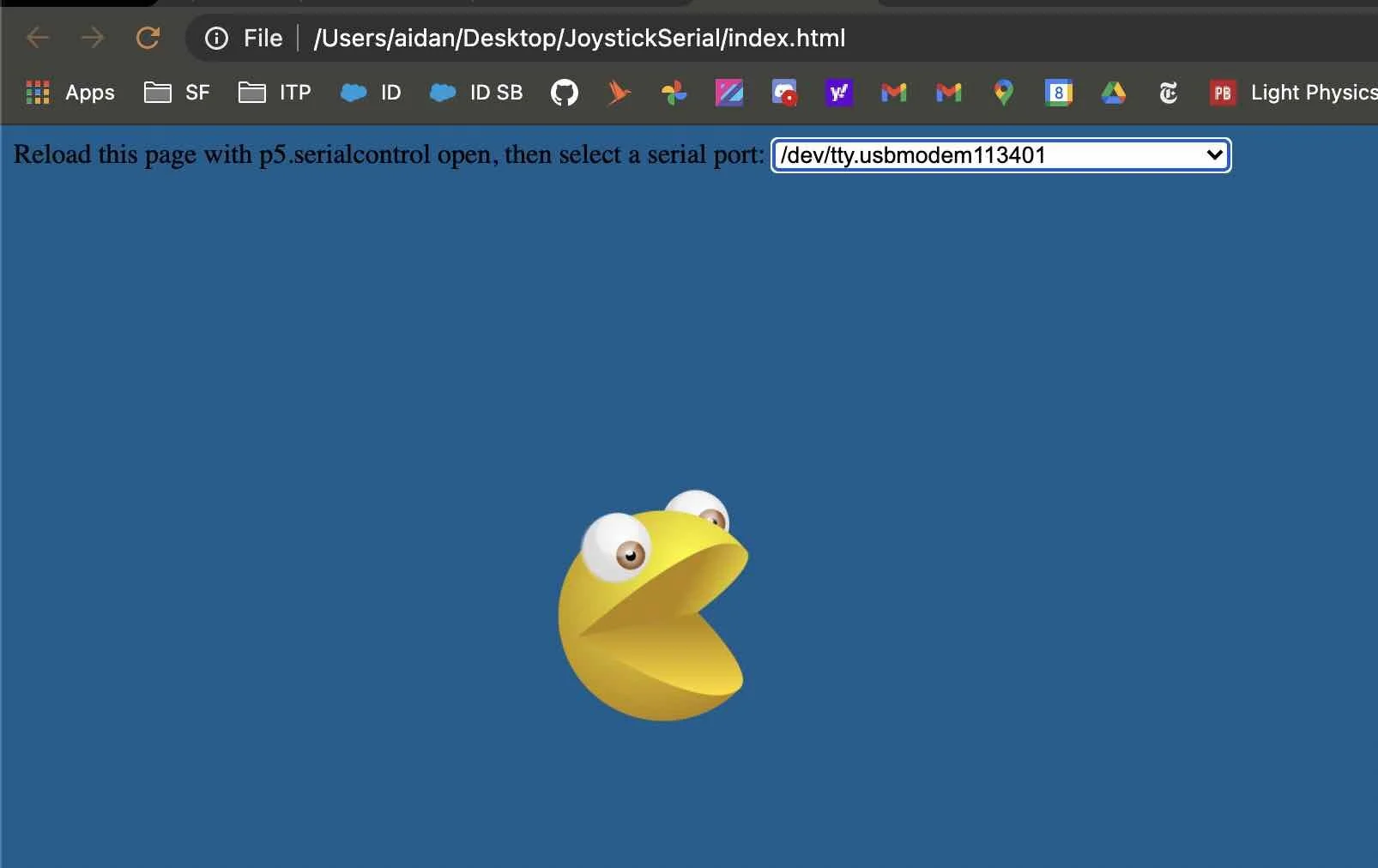This week I created a basic browser application which receives input from an arduino. The website has a dropdown menu that is connected to p5 serial control. You select the port that you want to listen which allows the browser to listen for the serial data that the arduino is sending. The arduino is connected to a joystick which is read through the analog pins (x and y direction) and a digital pin (the joystick button press). This information is packaged into a json object and sent through the serial line. The browser app which uses the p5 serial library has an event listener for serial data, when this data comes in, the app checks for a button state which when changes from 0 to 1, triggers the background of the website to change colors. When the x and y data from the joystick changes, an image of pacman is moved around the screen accordingly.