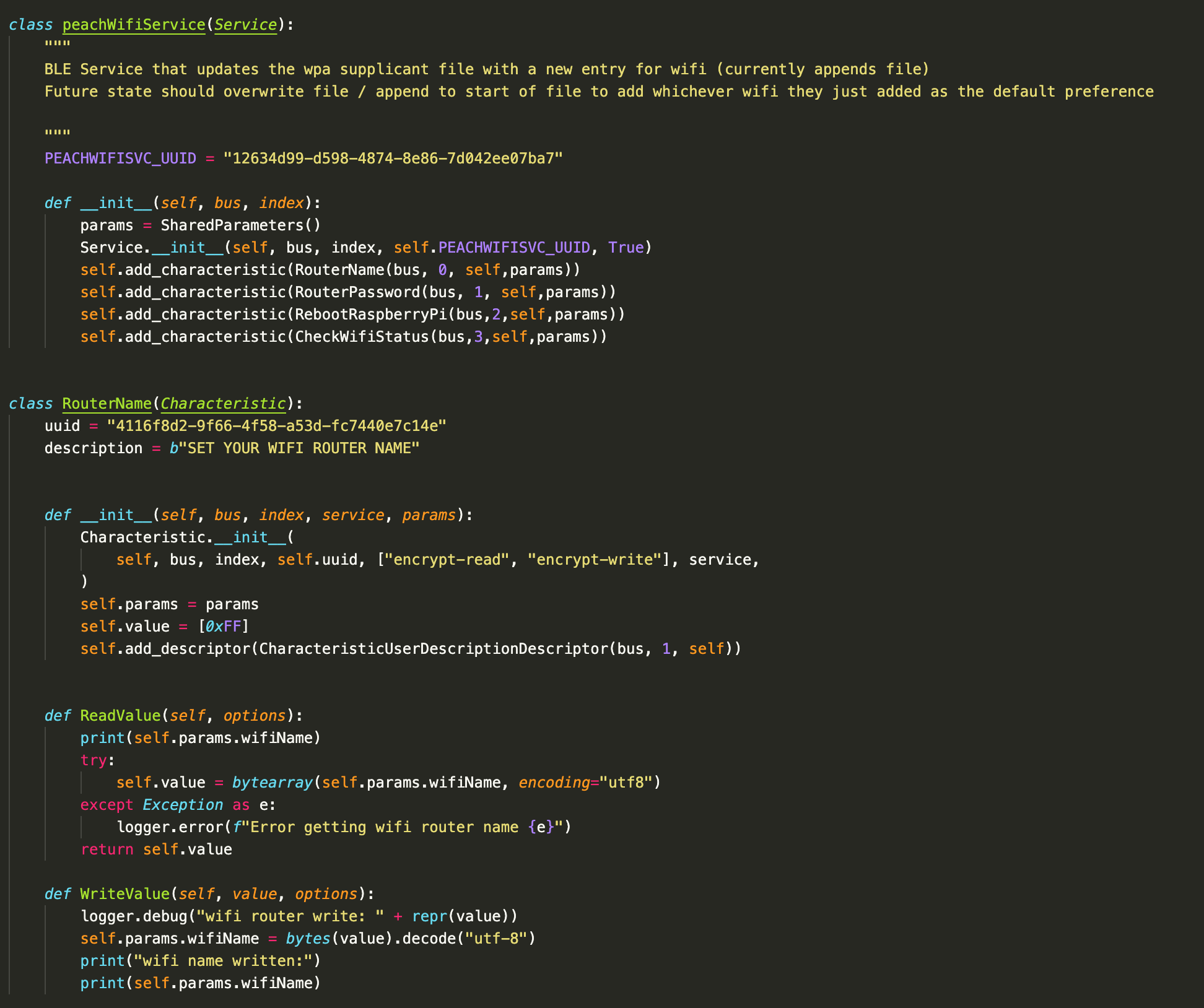 A class that creates shared parameters and methods between the BLE characteristics. Create wifi config opens the wpa_supplicant file, writes the new wifi name and password to the end of it and saves it. Then the raspberry pi reboots itself allowing it to connect to the new wifi. Connection details can be read from another characteristics.
