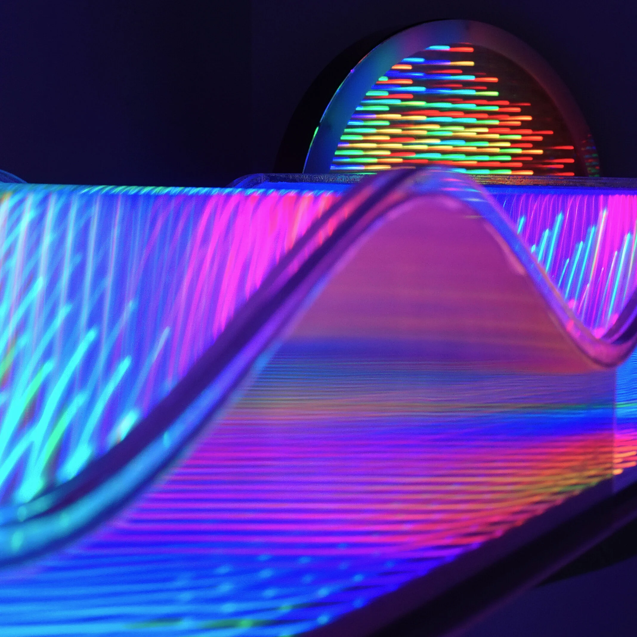 An exploration of the physical bending of light through a box entirely constructed from lenticular lens. The top of the box is made of the lens arranged in a sinusoidal wave pattern, the edges of the box are perpendicular pieces of lenticular. When viewed from different angles, the light contained in the box appears to defy the laws of physics stretching and bending into an apparent infinite pattern that is quite difficult for the viewer to process, creating a sense of wonder and confusion. From other angles the light appears to be moving in waves, beams, and individual pillars of lights.